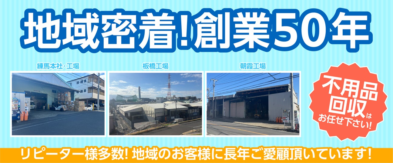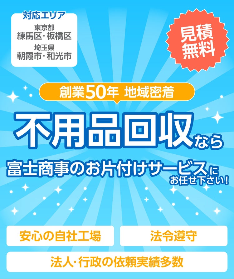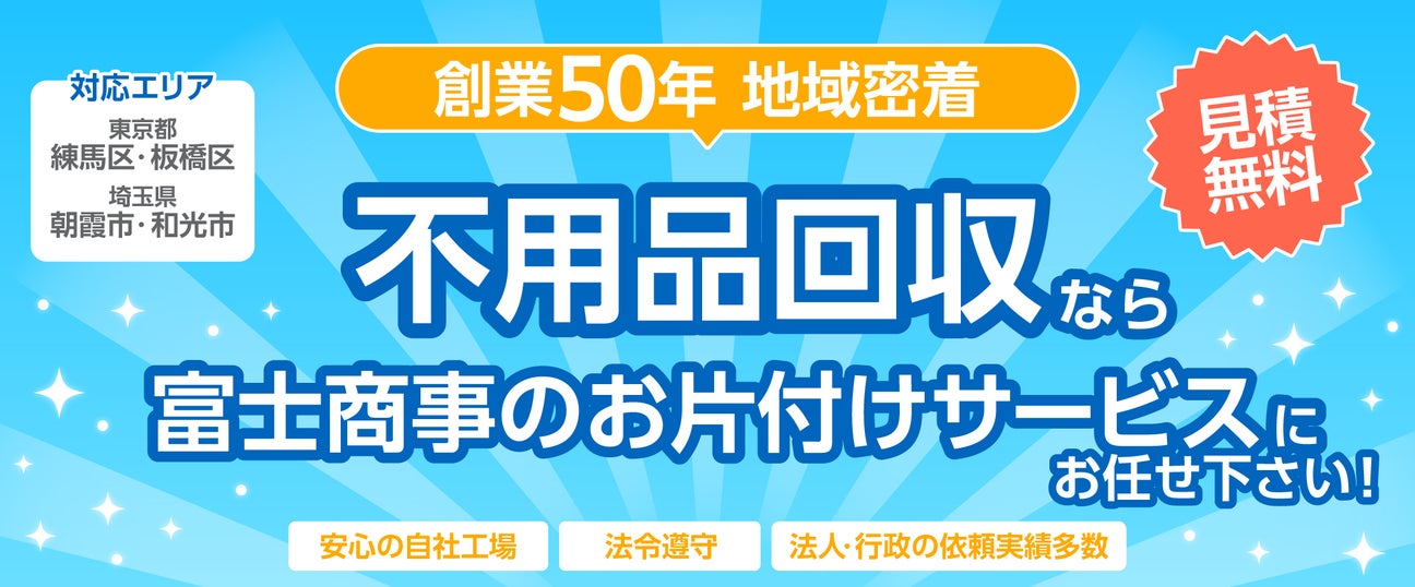 富士商事のお片付けサービスは、創業50年の地域密着企業です。練馬・板橋・朝霞・和光エリアで、お急ぎのご依頼にも最短即日で対応いたします。地域とともに歩んで50年。長年の信頼と実績で、多くの企業様、行政のお仕事をお任せいただいております。個人のお客様にも安心してご利用いただけます。